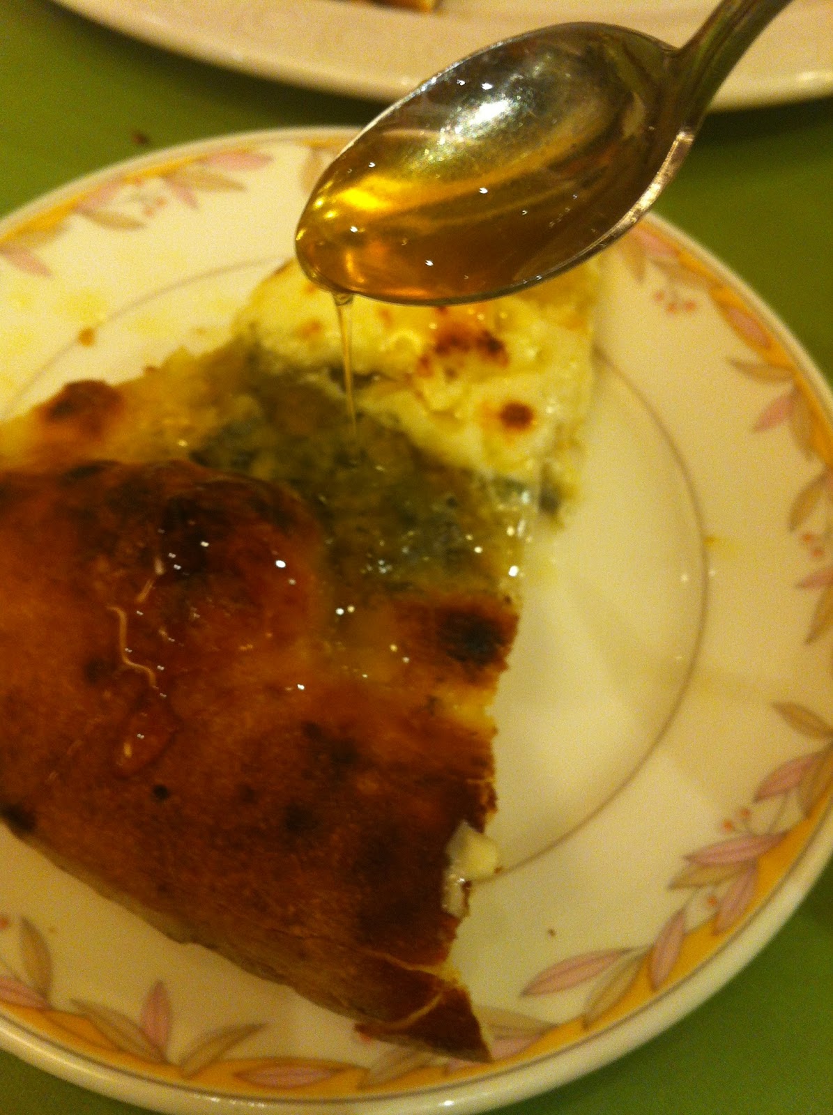 クアトロ・フロマージュは、4種類のチーズが乗ったピッツァですが、オーナーの方がハチミツをかけて食べてみませんか?と言われるので、掛けて食べてみた。