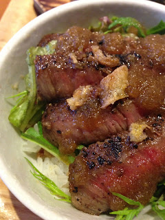最初は、塩やわさびと醤油で戴きます。ご飯を半分くらい食べた頃に、サラダと肉を乗せて特性ソースをかけて、ステーキ丼にします。これがまた旨い!!このソースと肉汁がご飯に混ざり、気がつくとご飯茶碗を持って掻きこんでいます。ペロッとなくなるよw