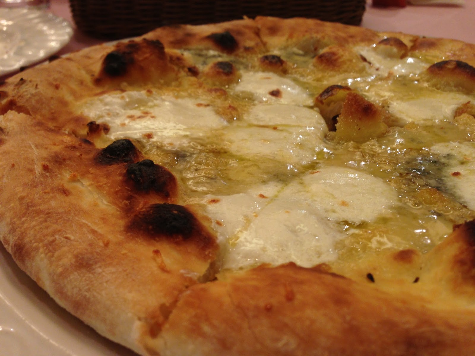 ここ「カンパニョーラ」で、ある意味一番のお気に入りが、クアトロ・フォルマッジ(4種のチーズピッツア)です。ブルーチーズのツンとした香りをハチミツがマイルドにします。甘さの中に酸味やチーズ特有の臭みと旨味が絡み合って、デザートとも料理とも取れる旨さを味わえます。ここ「カンパニョーラ」に来たら、「4種類のチーズピッツア、ハチミツを付けて下さい」と注文して下さい。マジで旨いから。