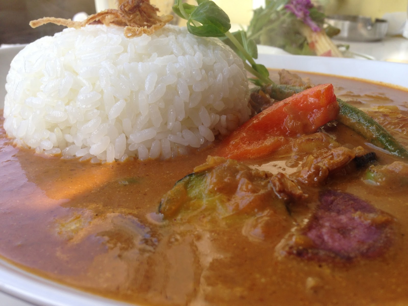季節の野菜を使ったスリランカカレー、ナスやズッキーニ、インゲンなどが素揚げして入っています。変わったところで、紅芋が入っているところかな?カレーの色で目立ちませんが掬い上げると、紅色の紫が目立ちます。