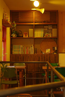 小さめの店内ですが、2階もあります。それでもキャパは10人ぐらいでしょうか?二階の真ん中には吹き抜けがあってキッチンが見下ろせます。御用のさいは、吹き抜けからお呼びください。とw