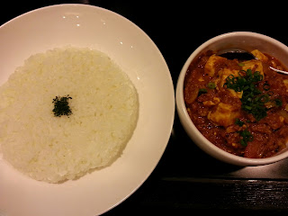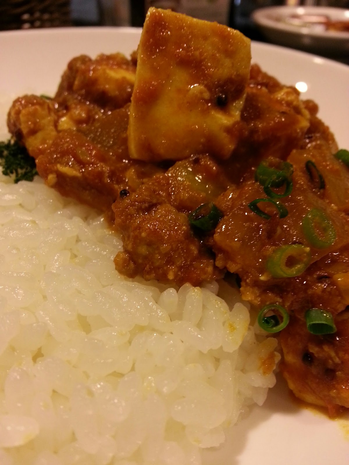 麻婆豆腐のカレー、ベースはトマトの汁っけが少ないカレーで、そこに豆腐など麻婆豆腐の具材が入り、四川テイストで味を加えている感じです。