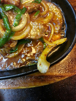 牛ロースや玉ねぎ、ニラと一緒にピリ辛味噌ソースで炒めたもの、ご飯がススムススムw
