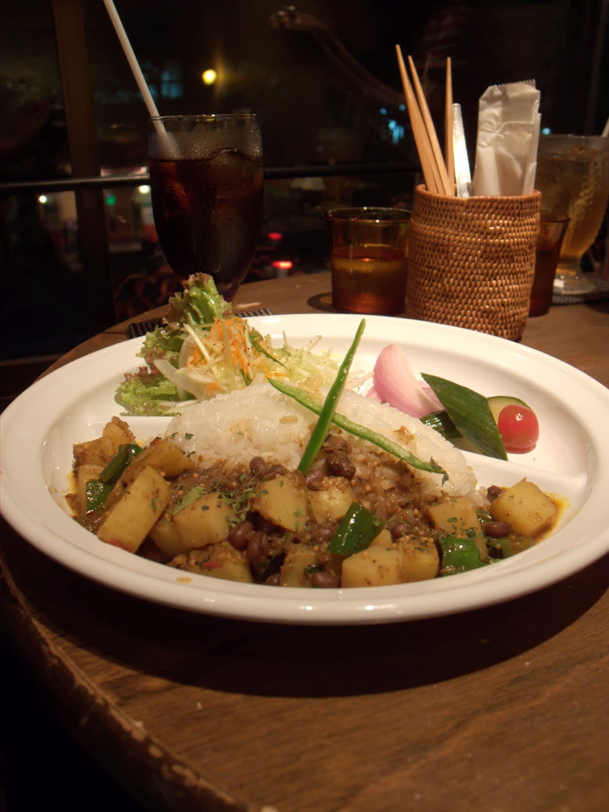 日替わりのカレーは、じゃがいもとピーマンのカレー、他にも椎茸や豆なども入ってて、具沢山な野菜カレーでした。