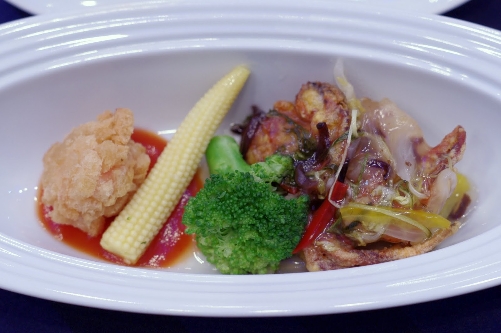 ソフトシェル黄身揚げ、白身魚、五目野菜入り甘酢あん掛け