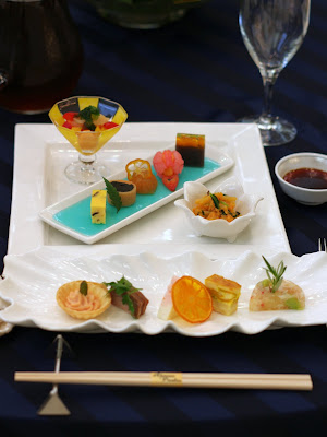 蟹身とチーズの袱紗焼き、海老の梅肉漬け、