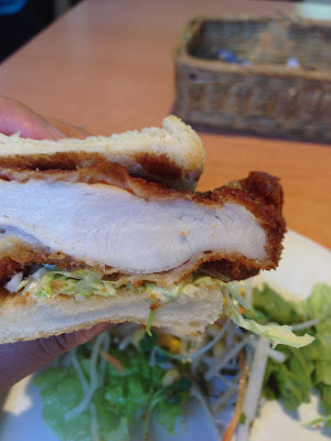 最初に出てきたのは、パン1枚に大きめのチキンカツが挟まっているチキンカツサンド、それにサラダが付いてきます。