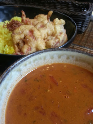 「うるしカレー」4品目はエビトマトカレー、香ばしく揚がったエビフリッター付きです。