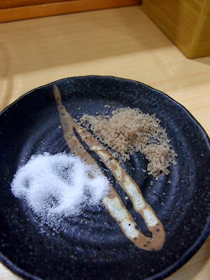 そして塩で戴く、右の茶色い塩は藻塩 |