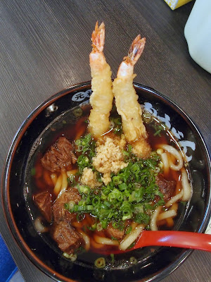 ベースが肉肉うどんしかないので 海老天にすると、肉と海老天のコラボになります |