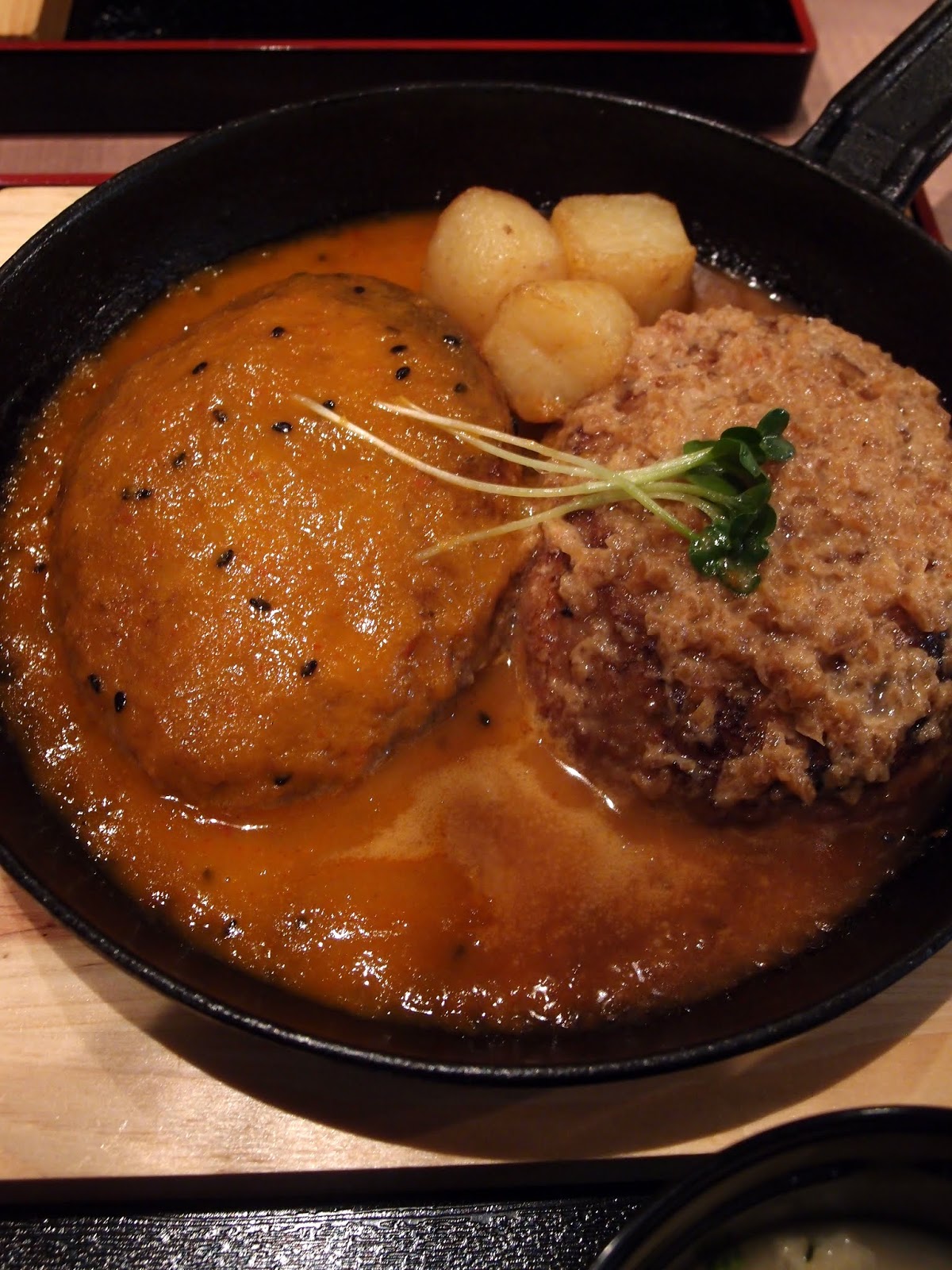ダブルハンバーグセットは、2種類のソースが選べますので、今回は2番人気の和風にんにくベースのスタミナソースと、豆板醤ベースのこく辛ソースにしました。