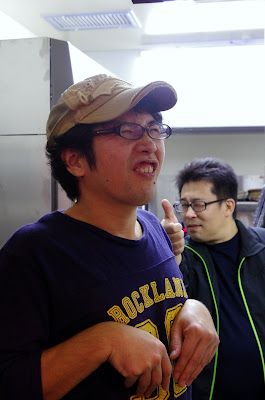 手前のコレ以上モテたら困るから変顔で写っているのが「家鴨軒」の店主家鴨長、奥で目にゴミが入った直後でしかめっ面になっているのが、「あどカフェ」の店長うっちーさん。