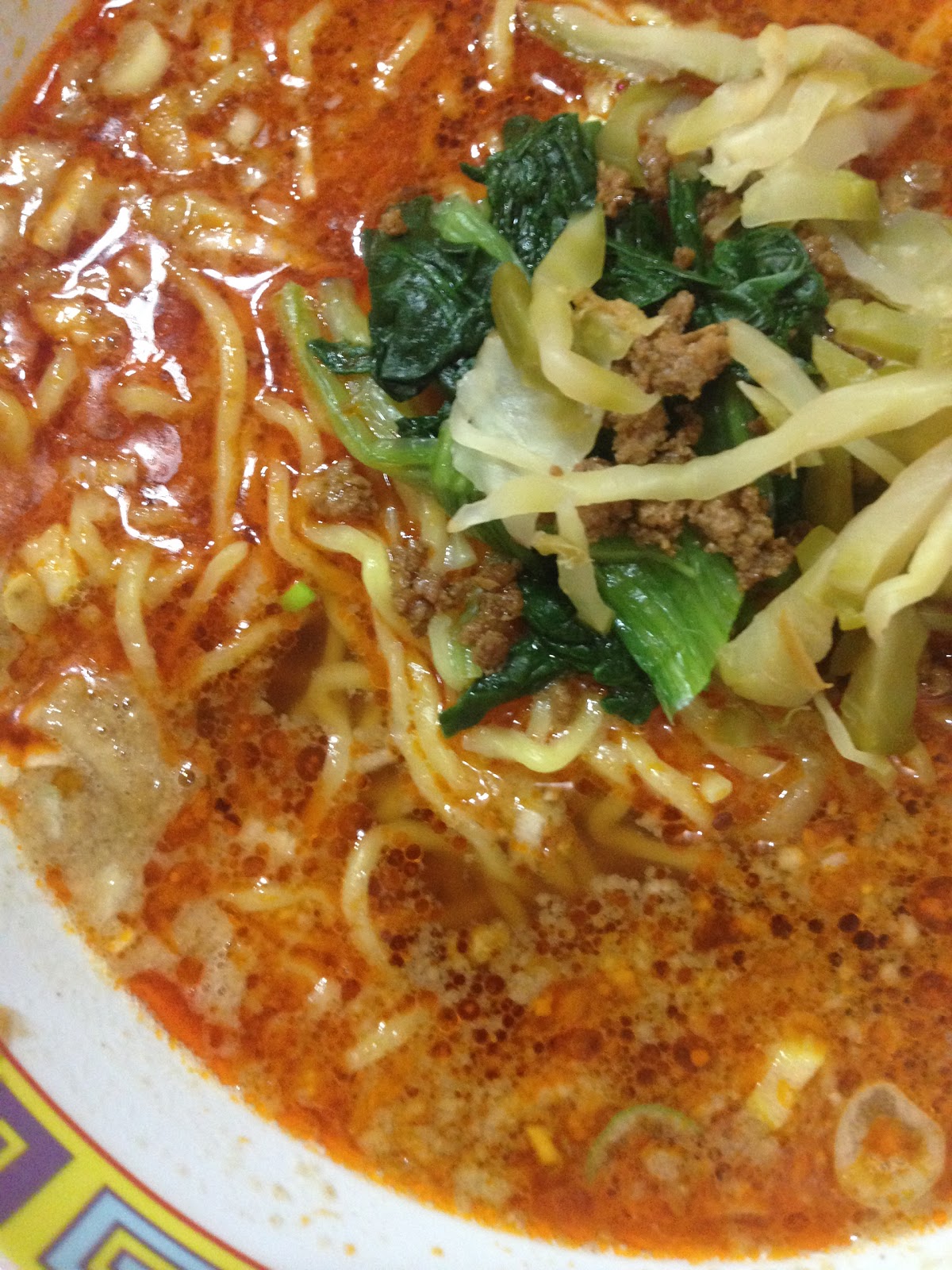 醤油と鶏ガラベースのラー油と唐辛子たっぷりの担々麺、チンゲンサイとザーサイを刻んだものも入っている。ゴマの風味も強く、なかなか旨い。