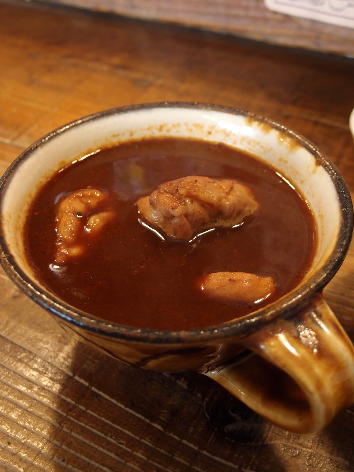 チキンカシミールカレー、スープ状のカレーで大きなチキンが3切れ入ってます。