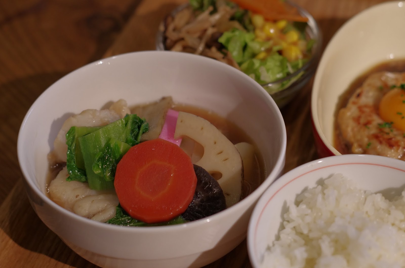 博多区「かえる食堂 蓮」で“アラ入り雑煮”と“なんこつ団子の月見のっけ”と“納豆温玉乗せパスタ”