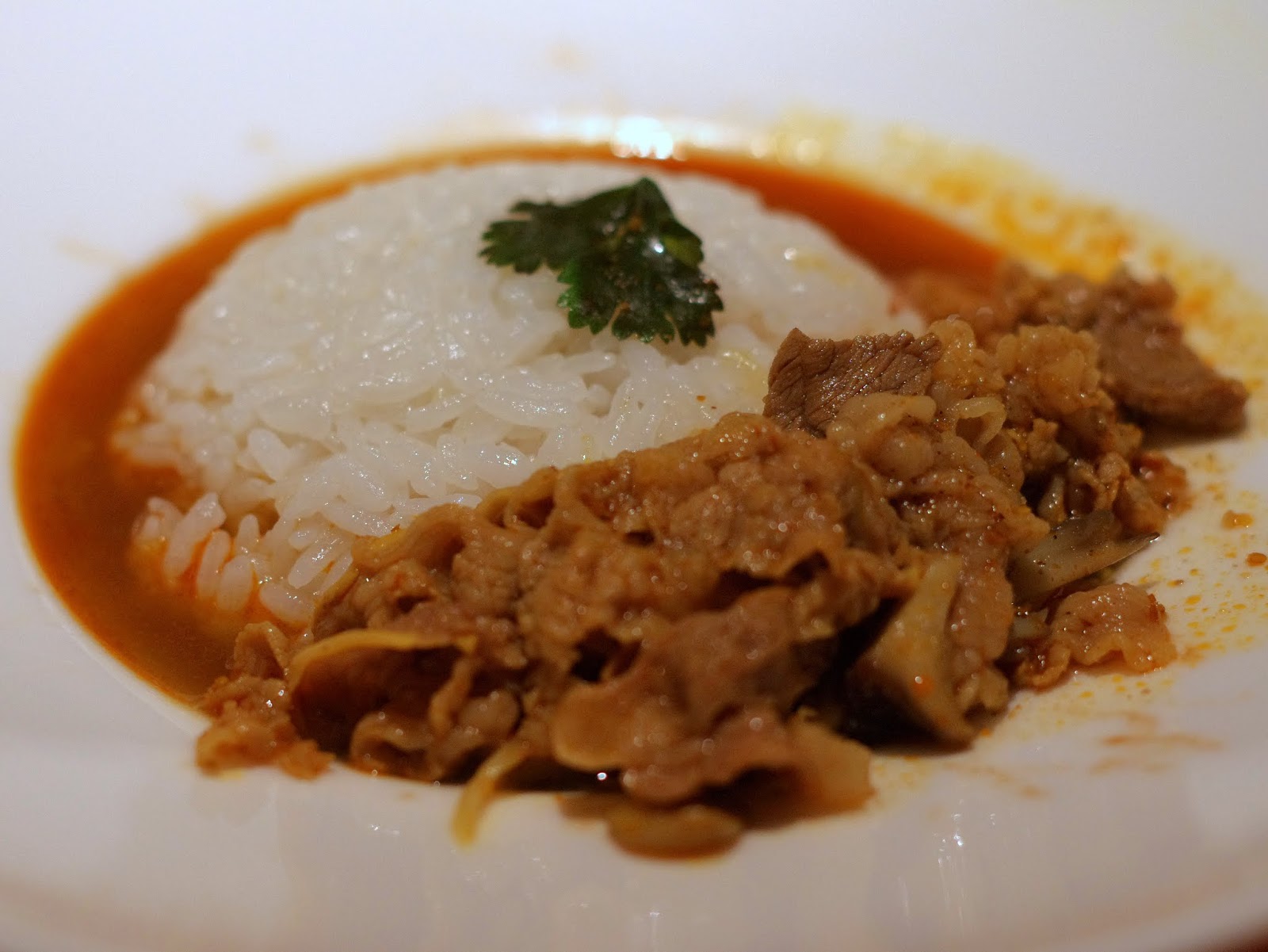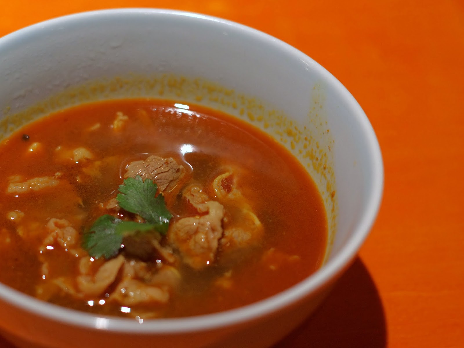 で、この直前にトップ写真の和えそばが出てきて、薄い牛肉のカレースープ 本場では、これよりもっと薄いスープが出てくるんだって〜 |