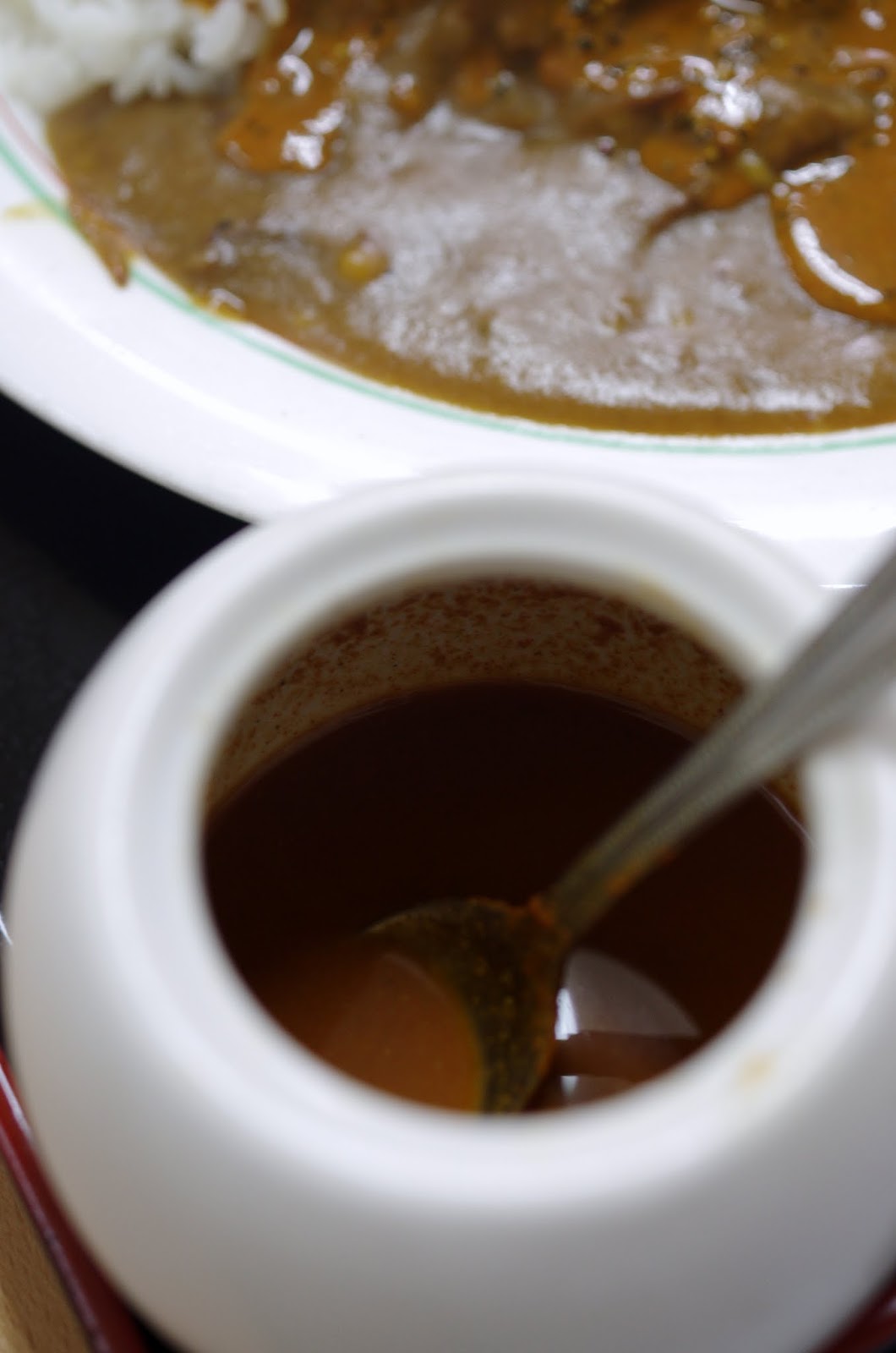 そして、一緒に出てくるスパイスを掛けると一気に味が変わります。深い食堂のカレーがスパイシーな欧風カレーへ。