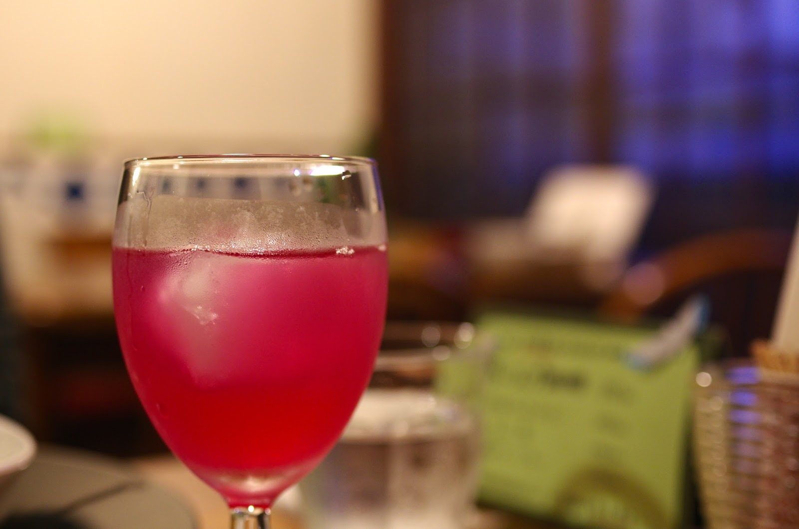カレーと一緒に出てきたのが、秋月の赤じそと甘木の天然百合蜜とおいしい水のみで作った自家製赤しそジュース、美しい色です。