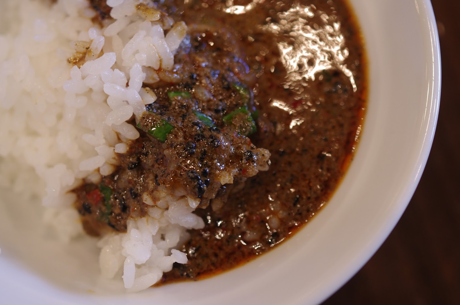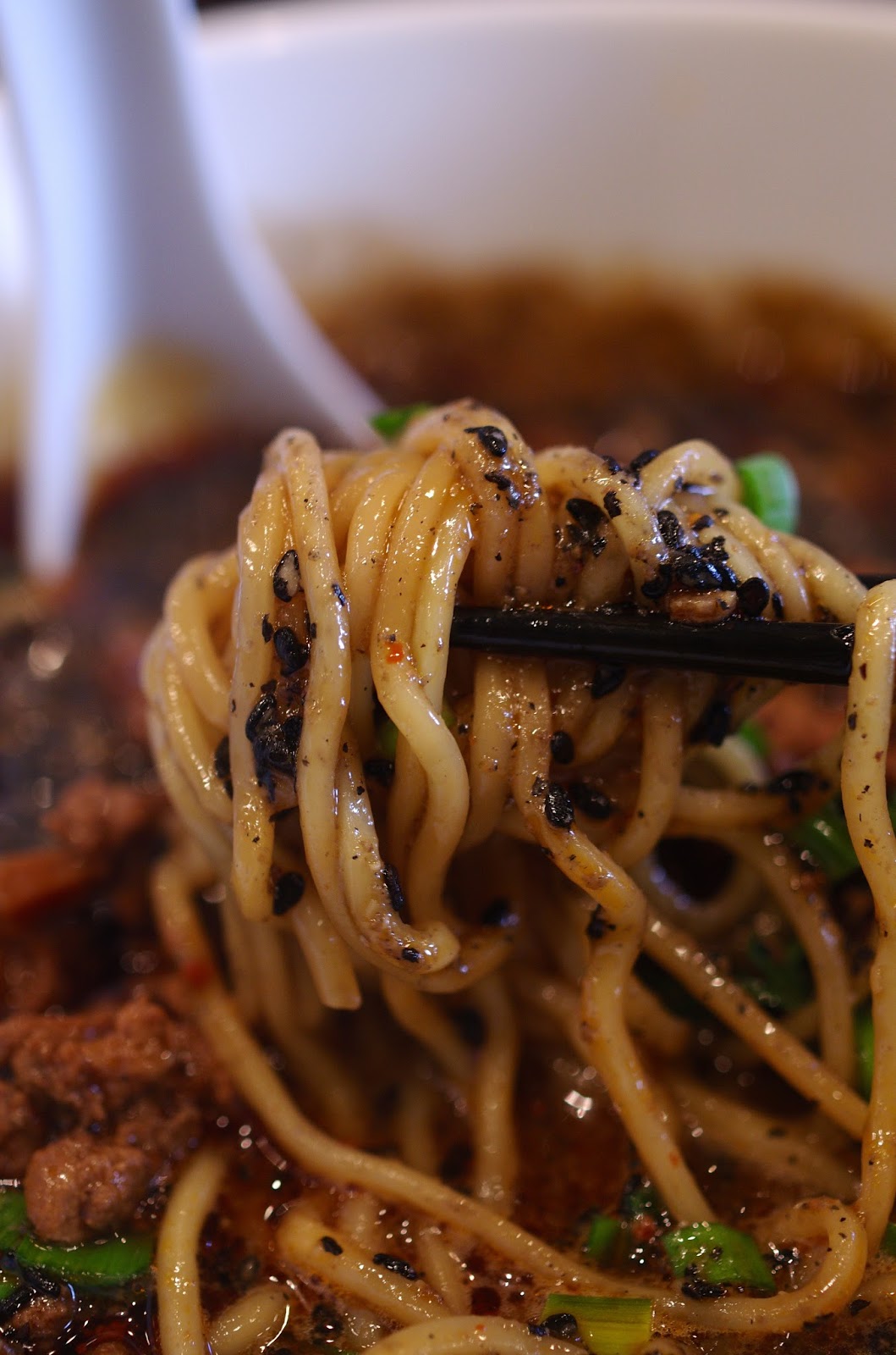 黒胡麻担担麺、もともとの担担麺の赤さに黒胡麻の黒が混ざり、かなり黒い担担麺と見た目からちょっと重そうな感じになってまして、その重そうな感じは口に入れると、濃厚な味に変わります。辛さは前回の麻辣大陸担担麺と汁なし担担麺に比べ穏やかな辛さですが、きちんと辛いので辛いのが苦手な方は注意して下さい。あ、辛いねって思う辛さだけどね。