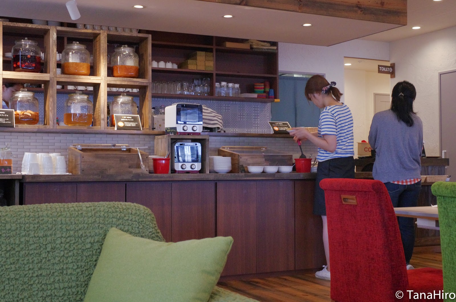 フレンチトーストのビュッフェ、自分で焼く楽しさがあるようですがホットプレートが1つなので混雑時には大変そう。ホットプレートの清掃もスタッフが合間にやってるので。