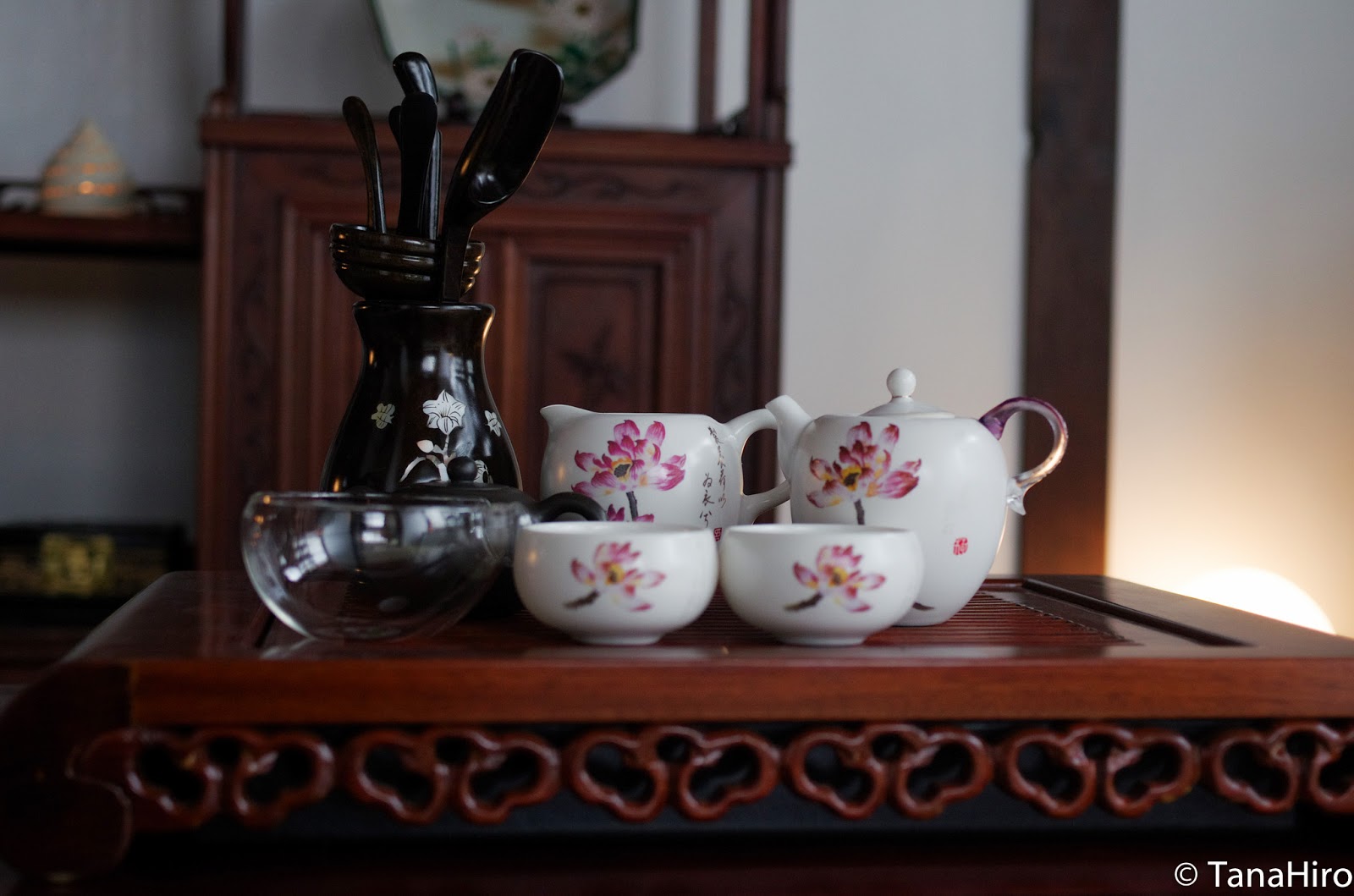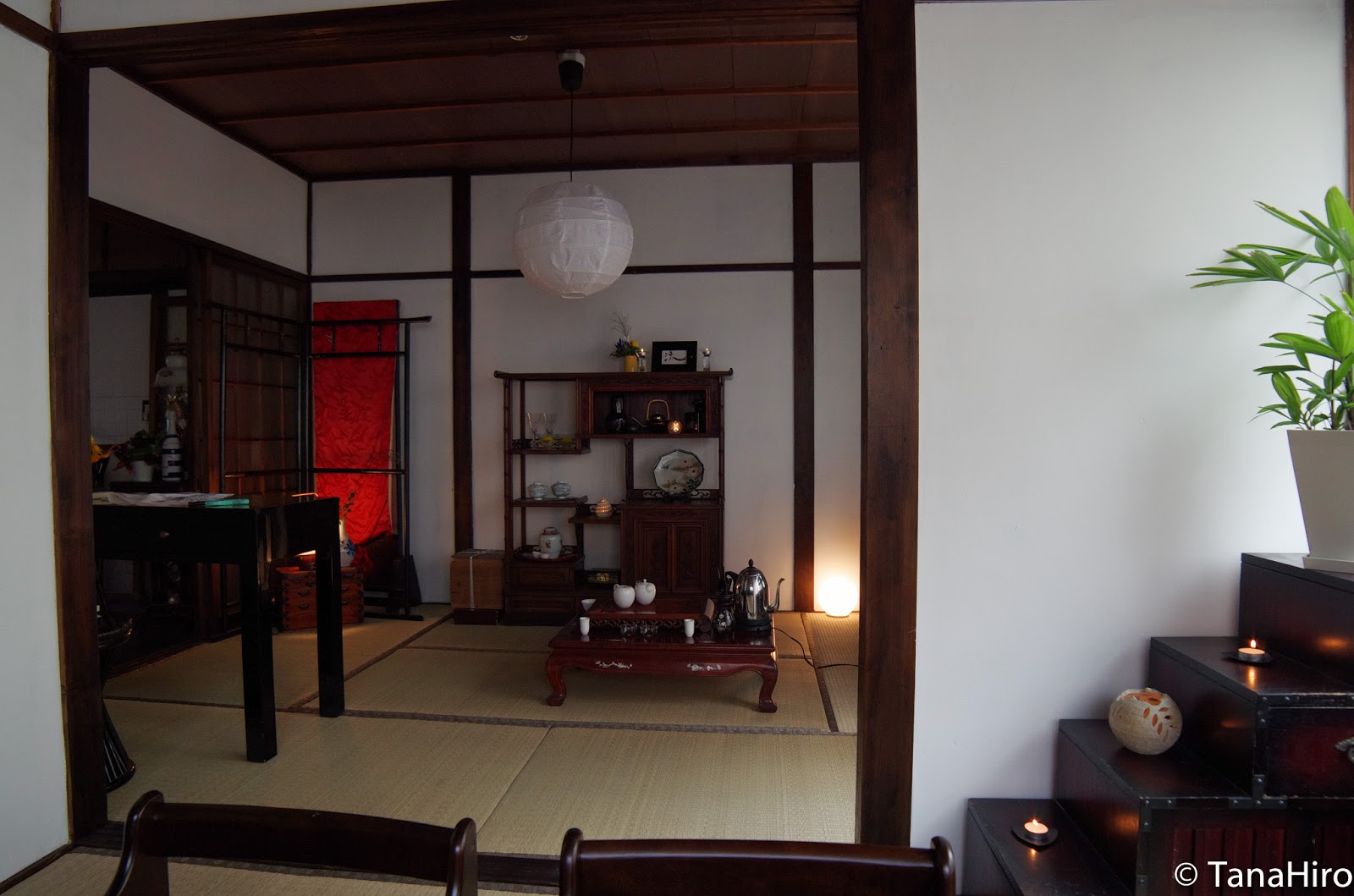 奥の部屋に通され、居間を見るような位置で座ります。この居間には座卓が置かれここでオーナーのゆずさんが、中国茶を淹れてくれます。普通ならシーンとした感じでお茶を淹れる作法を披露し、見る方もお茶を淹れる作法に見惚れるのでしょう。