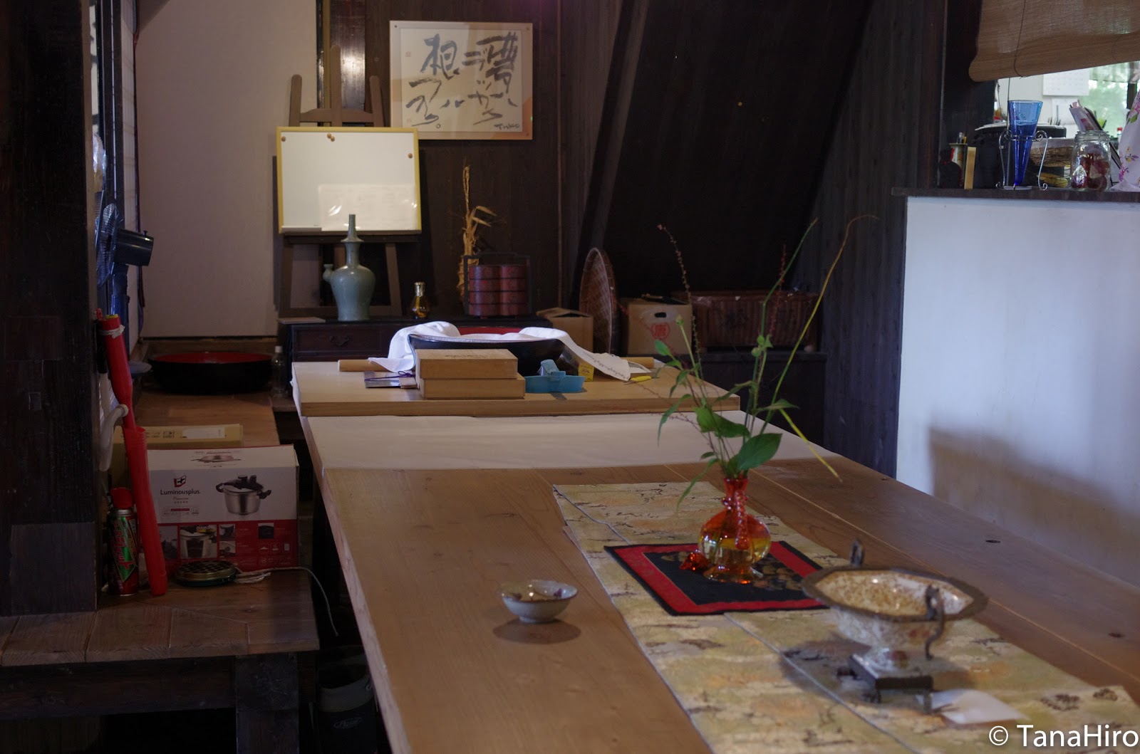 店は外から見ると農家の古家です。中に入ると昔ながらの土間があり縁側がありそのままの形を利用されています。縁側と客間と居間にテーブルを起き6〜7組20人くらいが座れるようになっています。