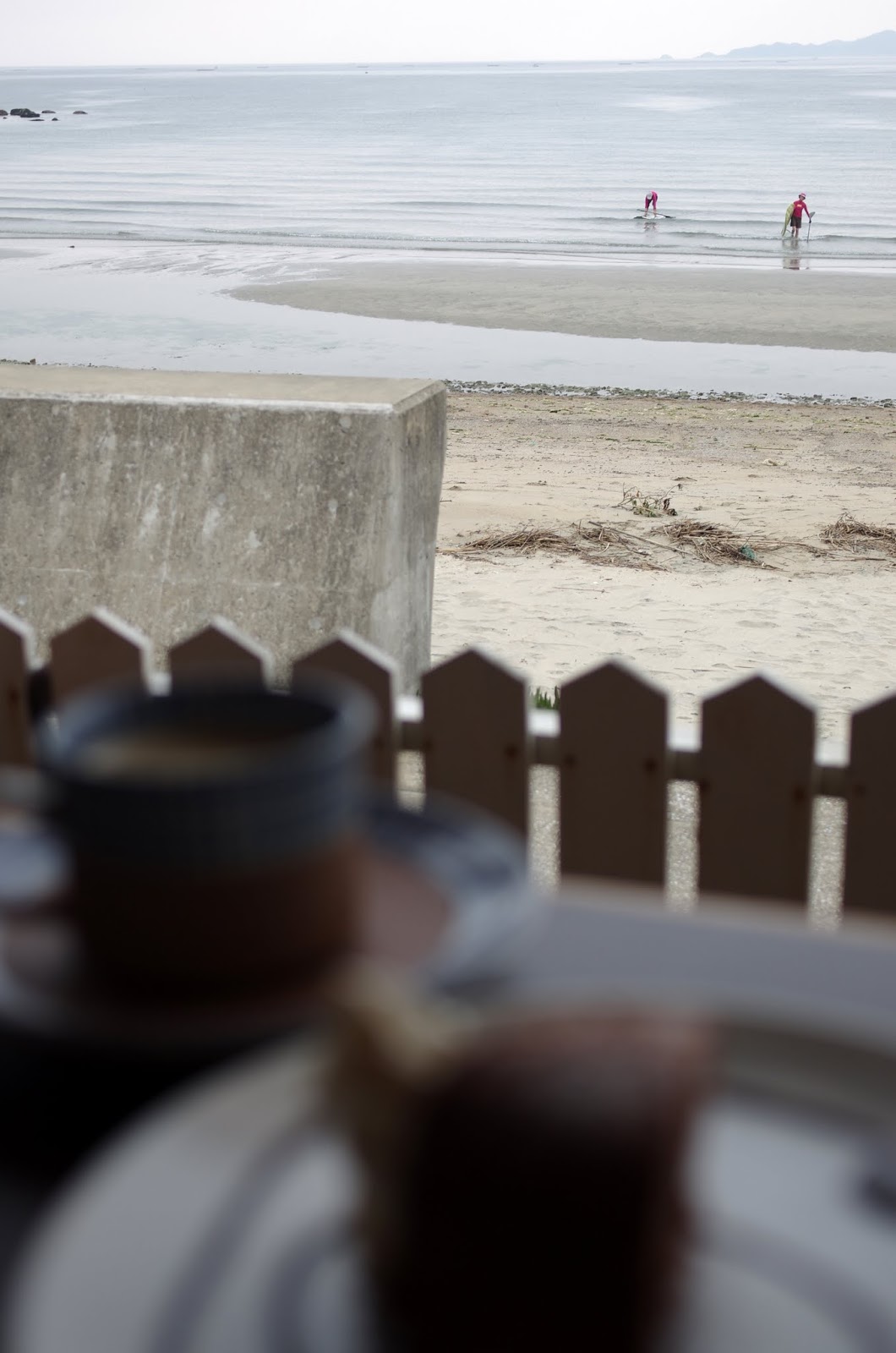お店は海岸沿いにあって、店内とテラス席が用意されています。テラス席から見える景色は、砂浜と海が一望できます。この日はあいにくの雨でしたが、ウィンドウサーフィンなど楽しんでる人達が居て、ゆっくり珈琲を頂きながら過ごしました。