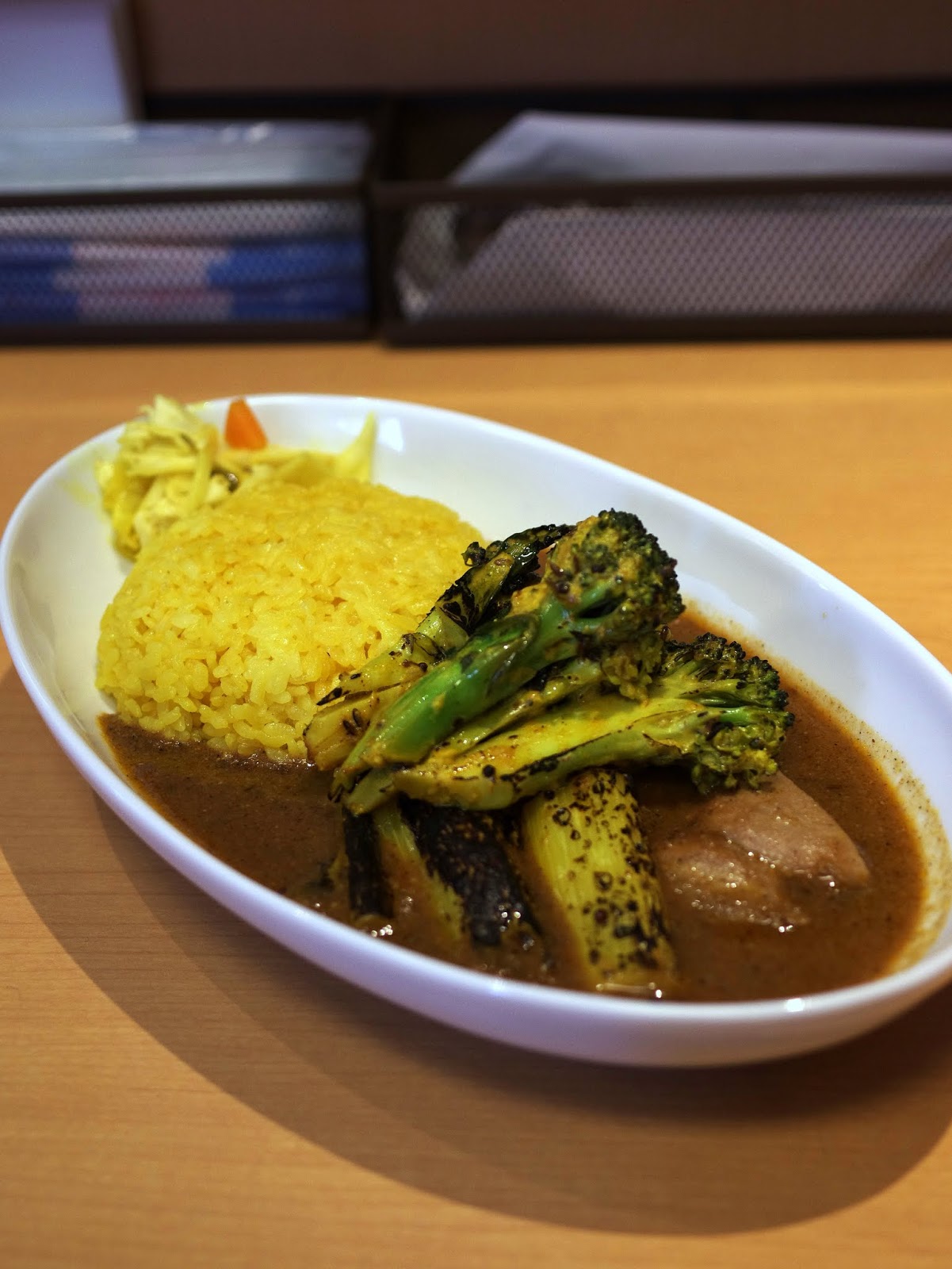 上の写真は、人気ナンバー1のチキンカレーでタンドリーブロッコリーと長ネギのスパイス炒めをトッピングしたカレー。