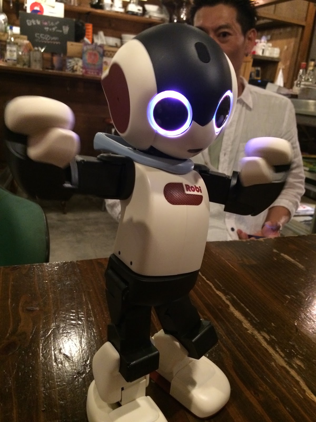 音声認識の感度を上げるため店の音楽を消してもらい、踊ったり腕立て伏せさせたり、色々させた。女性の可愛いって悲鳴にも似た言葉と違って、私はすげーなー、可動部分どうなっとるとやろか?とか、サーボ何個入っとると?とか、手を振ってるのにバランス制御で動かしている腰や足見たりと技術的興味の方が前に出てたw