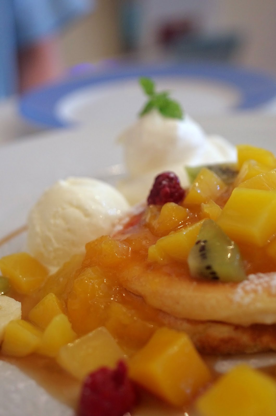 マンゴーやらキウイ、バナナが乗っててスイーツ系パンケーキになります。