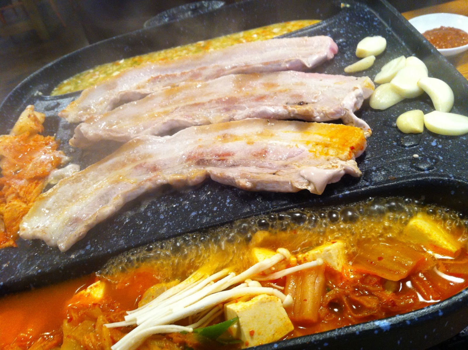 | サムギョプサルと玉子の奴とチゲが食べれる画期的な鉄板だって |