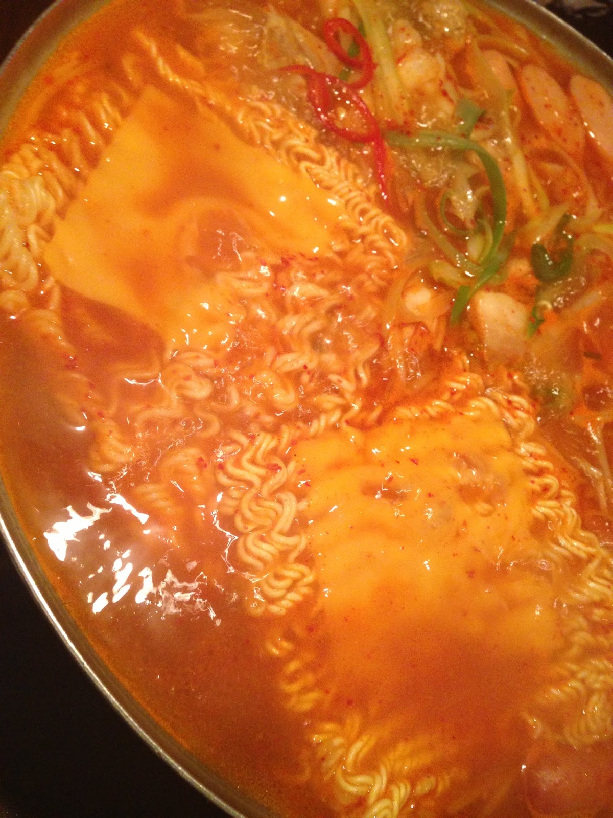 ブデチゲのブデは部隊の意味で、朝鮮戦争時に米軍の兵士が自分達が所持していたハムやチーズなどを韓国兵たちが食するキムチ鍋に入れて食べたことが始まりだと言われてます。比較的歴史が新しい鍋料理です。これに韓国インスタントラーメンの麺を入れます。(店によっては〆で入れるけど芭李呑では最初から入ってました。)韓国インスタントラーメンの麺は、少しもちっとしてて伸びにくいので、最初から入れてても大丈夫なんでしょうね。