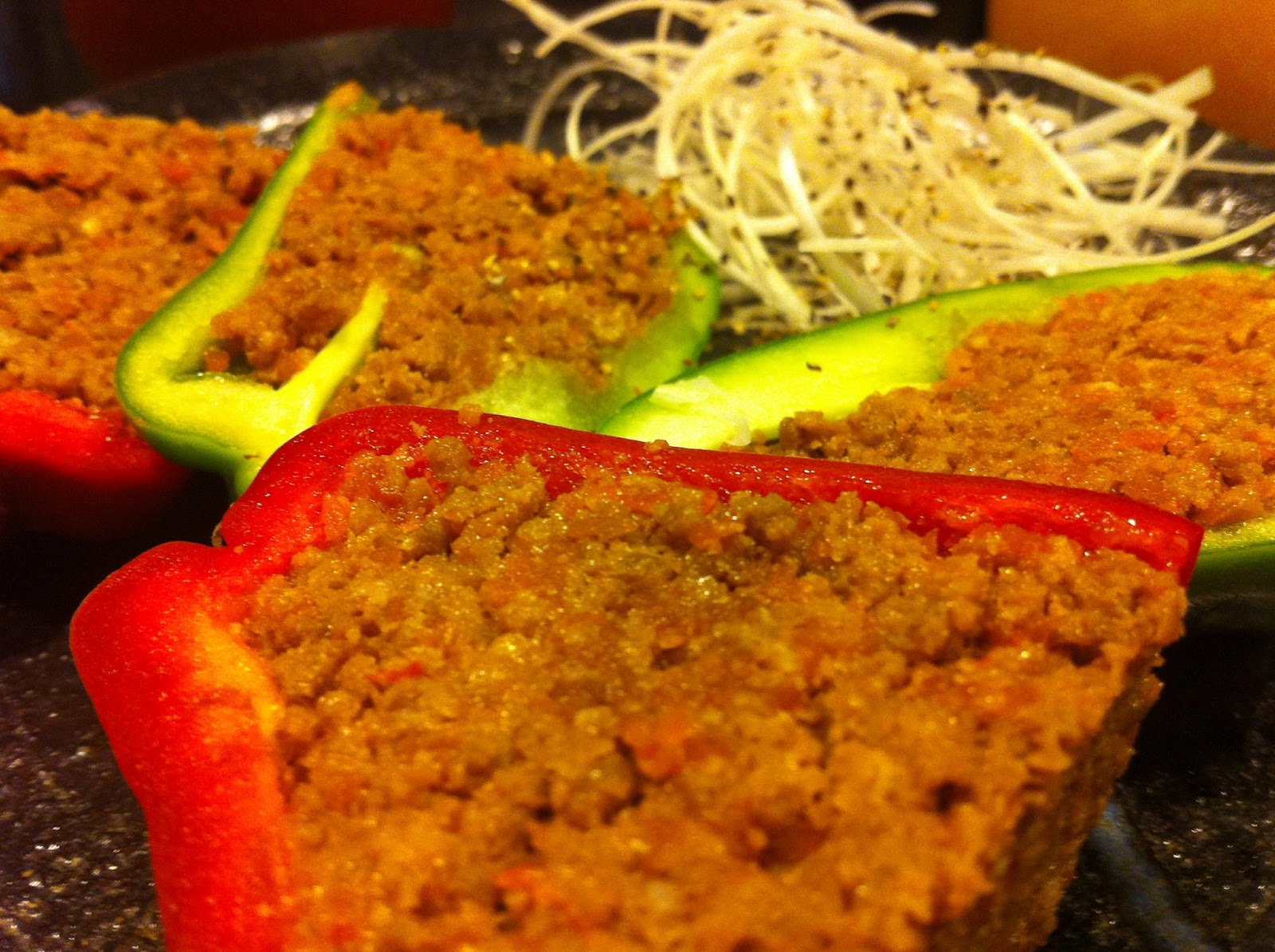 ピーマンが生なんです。生のピーマンにスパイスで味付けされたそぼろ(ハンバーグみたいに焼いてない)、そぼろ肉は冷やしてあるので、冷たくてスパイシーな味付けで、暑い日にもってこいの一品です。(冬でも食べるけどねw)