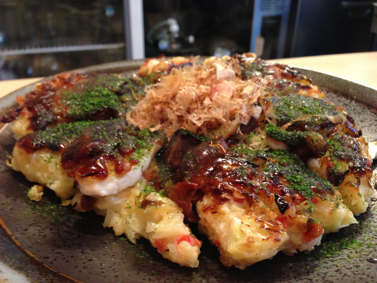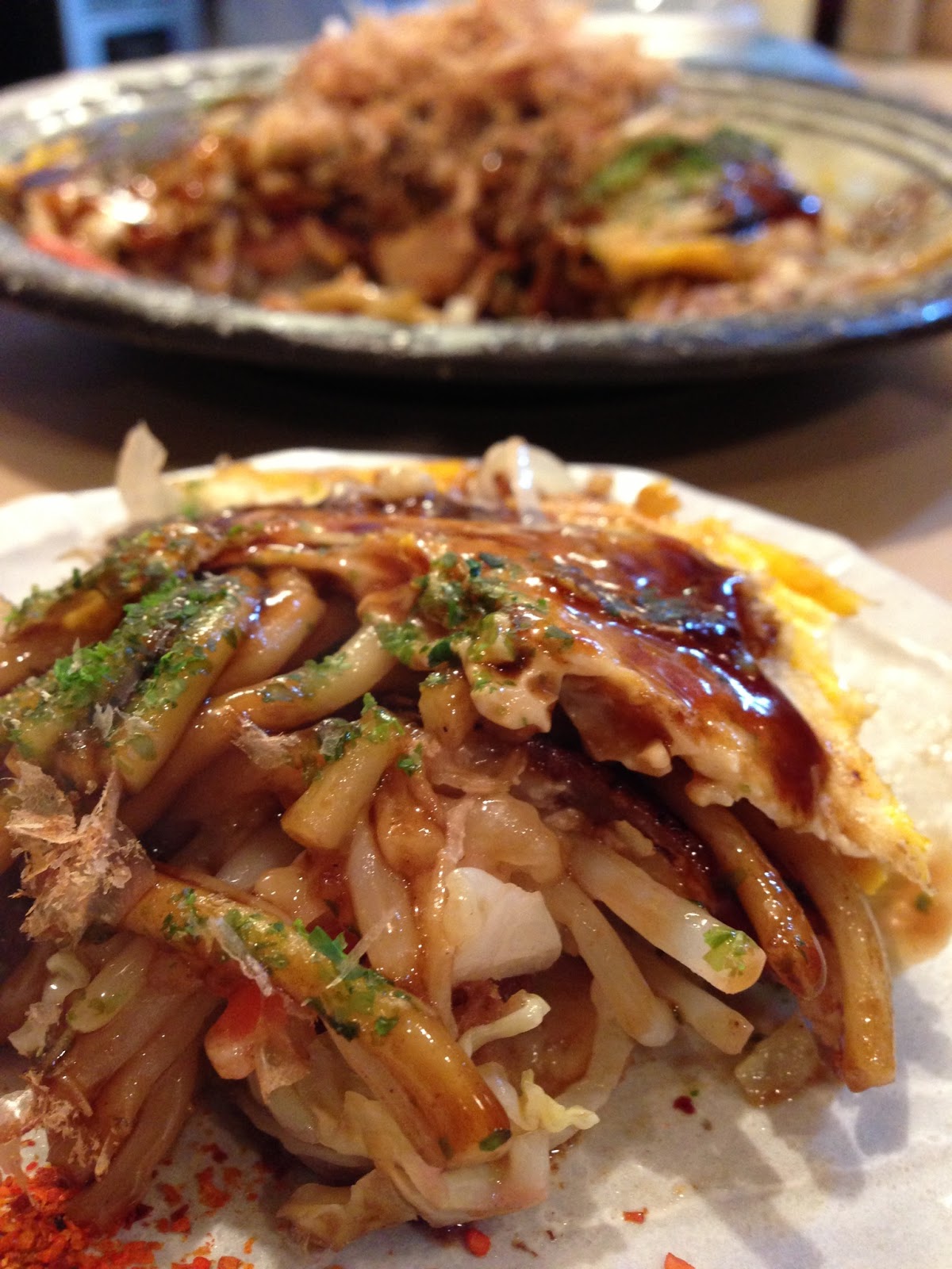ソースは、口当たり優しく、しつこくさもない。生地や具材にしっかりと下味を付けてあるので、ちょっとあっさりめのソースがよく合う。豚バラはパリパリに、海老やいかはプリプリに、キャベツやもやしはシャキシャキが残るように、絶妙な感じで火を通してる。揚げ玉や紅しょうがも入ってる。