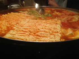 ブデチゲのブデは部隊の意味で、朝鮮戦争時に米軍の兵士が自分達が所持していたハムやチーズなどを韓国兵たちが食するキムチ鍋に入れて食べたことが始まりだと言われてます。比較的歴史が新しい鍋料理です。これに韓国インスタントラーメンの麺を入れます。(店によっては〆で入れるけど芭李呑では最初から入ってました。)韓国インスタントラーメンの麺は、少しもちっとしてて伸びにくいので、最初から入れてても大丈夫なんでしょうね。