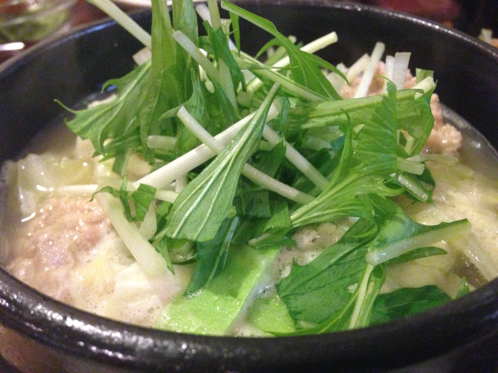 | 博多水炊きらしく白濁スープに水菜とキャベツ |