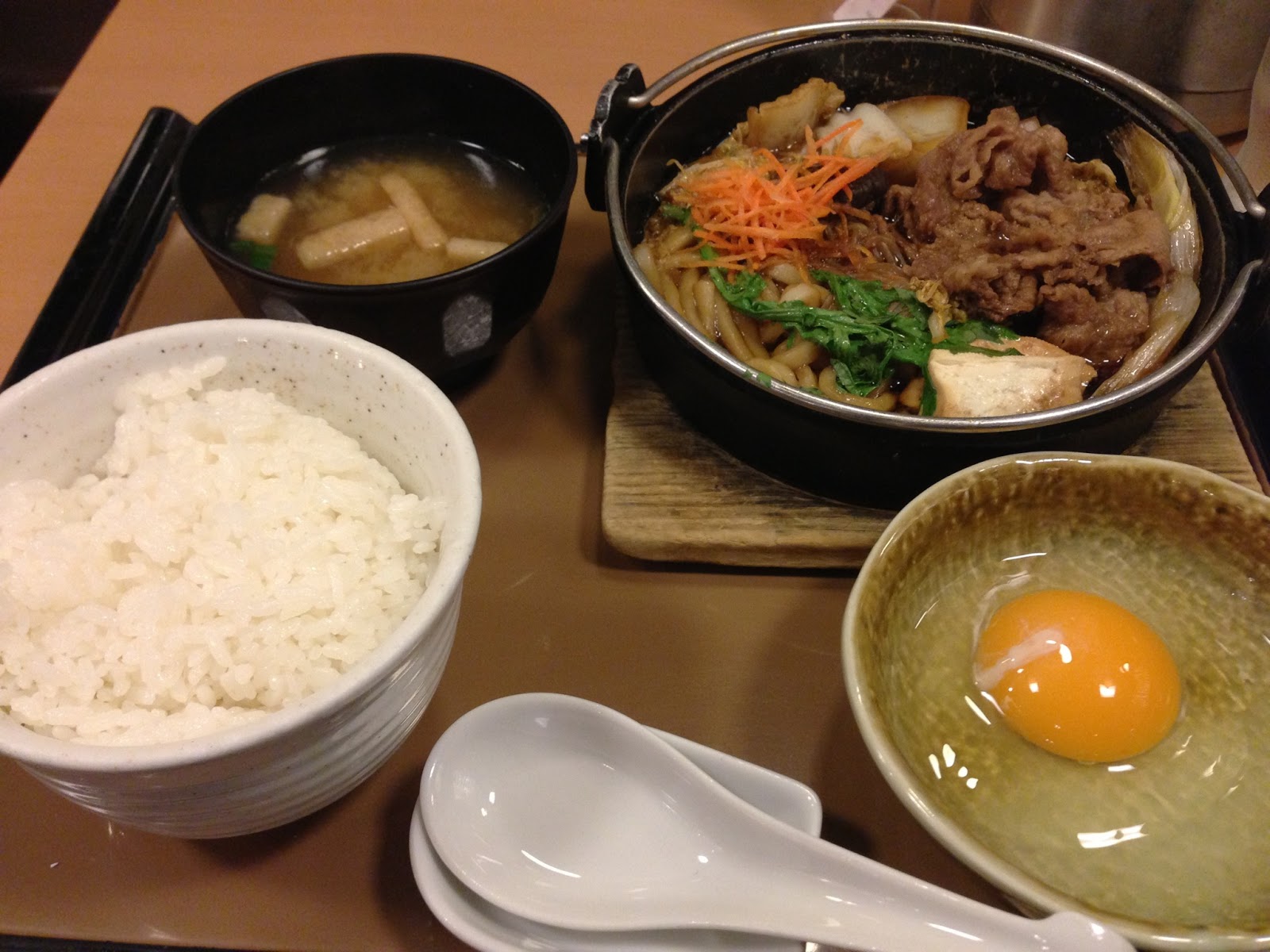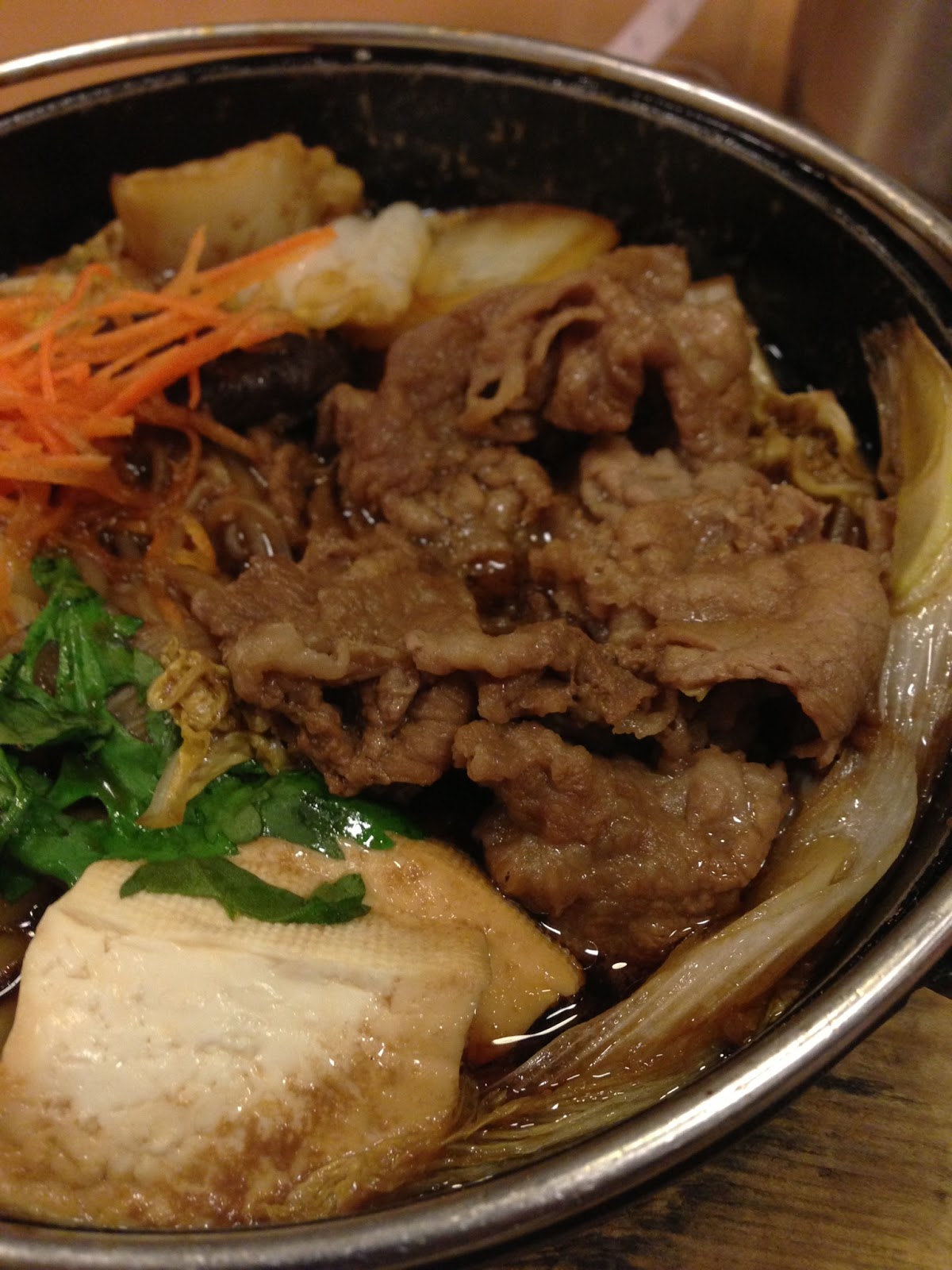 すき焼きは、牛肉、白菜、白ネギ、豆腐、糸こんにゃく、椎茸、春菊、ニンジン、それにうどん麺、うどん麺が最初から入っている以外は至って普通の具材です。生卵も付いてくるので、肉や野菜をタマゴに絡めて頂きます。