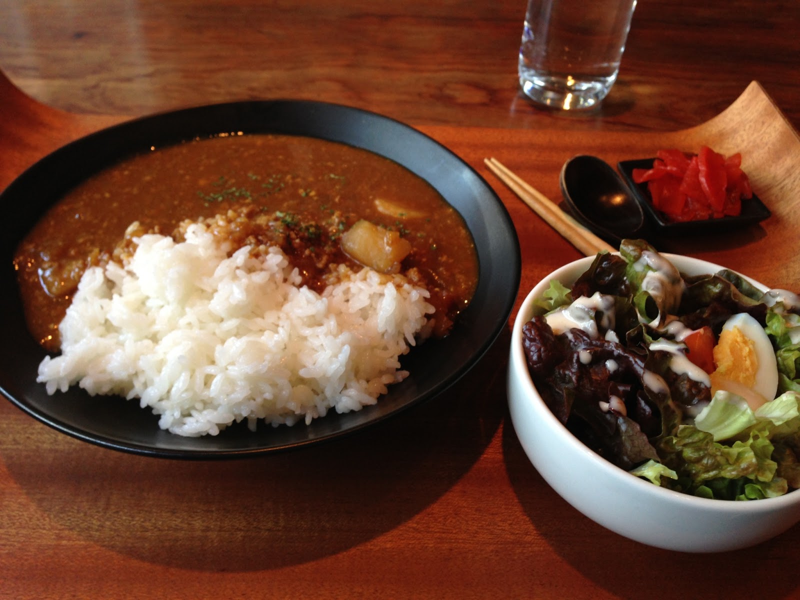 カレーはオリジナルのカレーで、野菜はすりおろして、挽肉たっぷりのちょっとサラサラなカレーです。スパイスは程よく効いているけど、カレー専門店で食べるようなカレーでは無く、家庭で作られるようなのカレーですが、わりと辛口。激辛とまで行きませんが、「お、わりと辛いね。」と思えるぐらい。なかなか旨い。