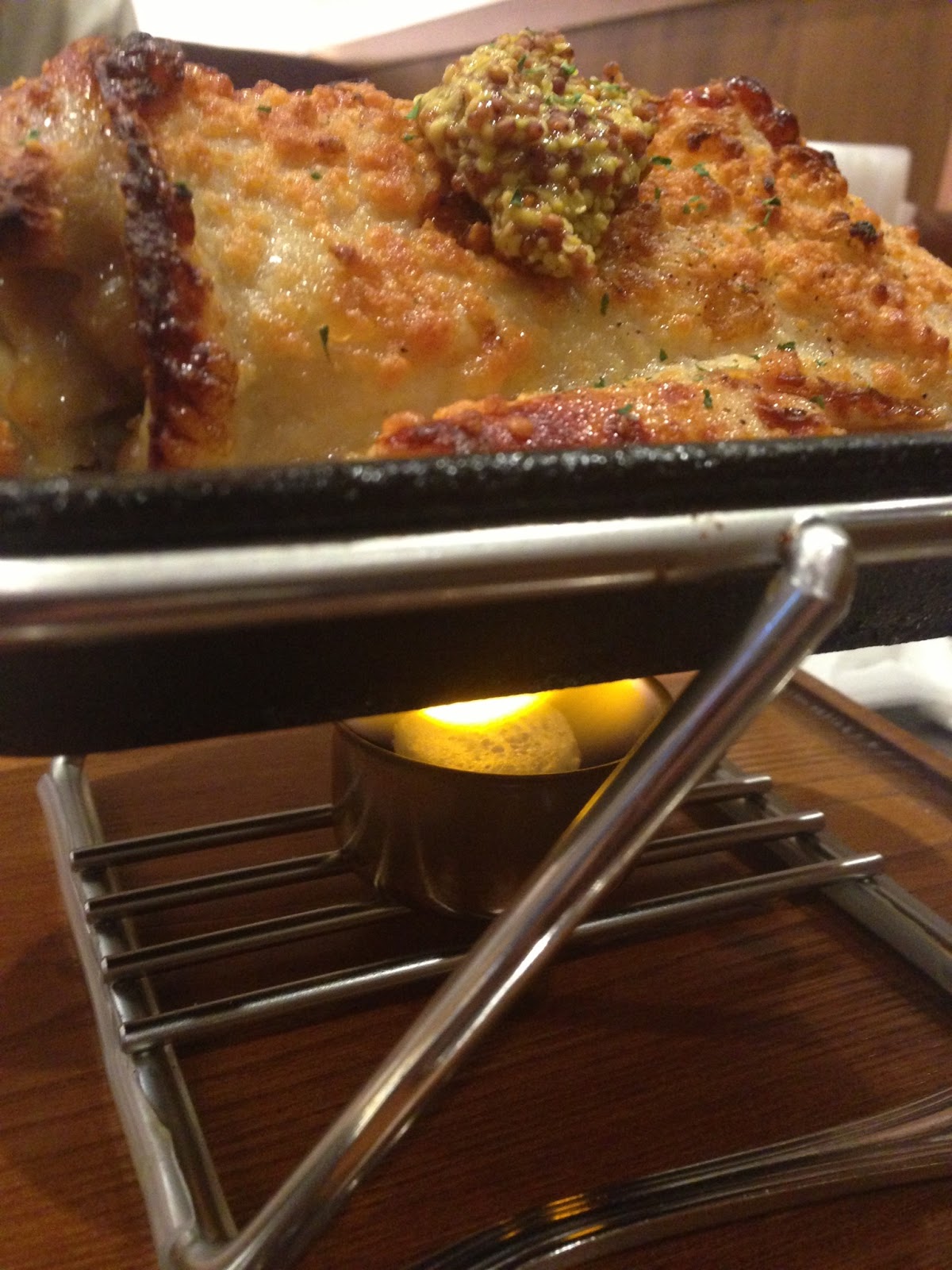 チキンは、今だけの限定メニューw 限定って言葉に弱いのですがw 表面はパリパリに焼け、中はジューシーで美味しい。ソースもマスタードをふんだんに使ってあり、わずかな酸味と辛味がチキンにとても合います。また鉄板の下では火が掛けられているので、最後まで熱々のチキンが食べれます。