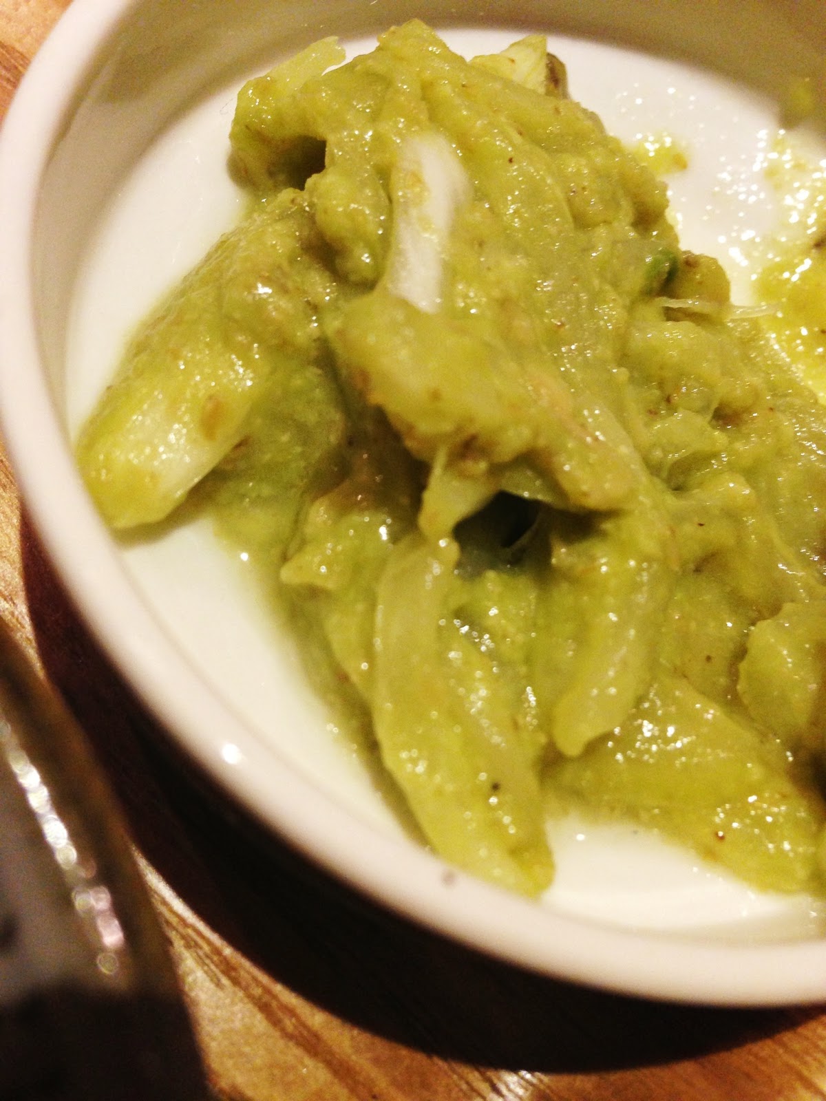 そして、小鉢に入っている緑色した物が、玉ねぎのアボカド和えです。玉ねぎのシャキシャキ感と、アボカド独特な柔らかさが、不思議な触感を感じさせます。こってりな感じのアボカドですが、玉ねぎと食べる事で、ホルモンの脂っぽさを口から消してくれます。この定食にぴったりの小鉢でした。