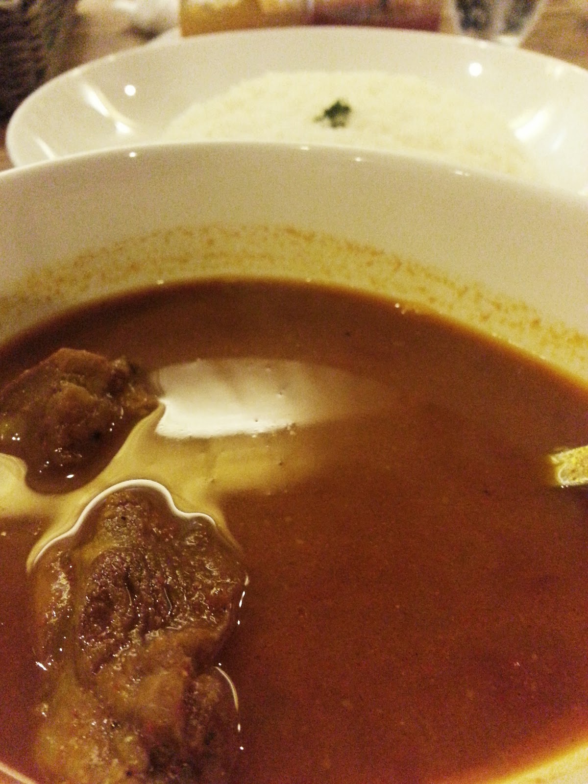 スープ状のカレールーに大きな鶏肉が入っています。ルーは、ピリッと辛く色んなスパイスが複雑に絡んできます。鶏肉はスプーンでも解れるくらい柔らかい。