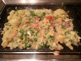 店員さんは、鉄板に火を入れ、タコを敷き、生地を流しこむところまで、やってくれます。