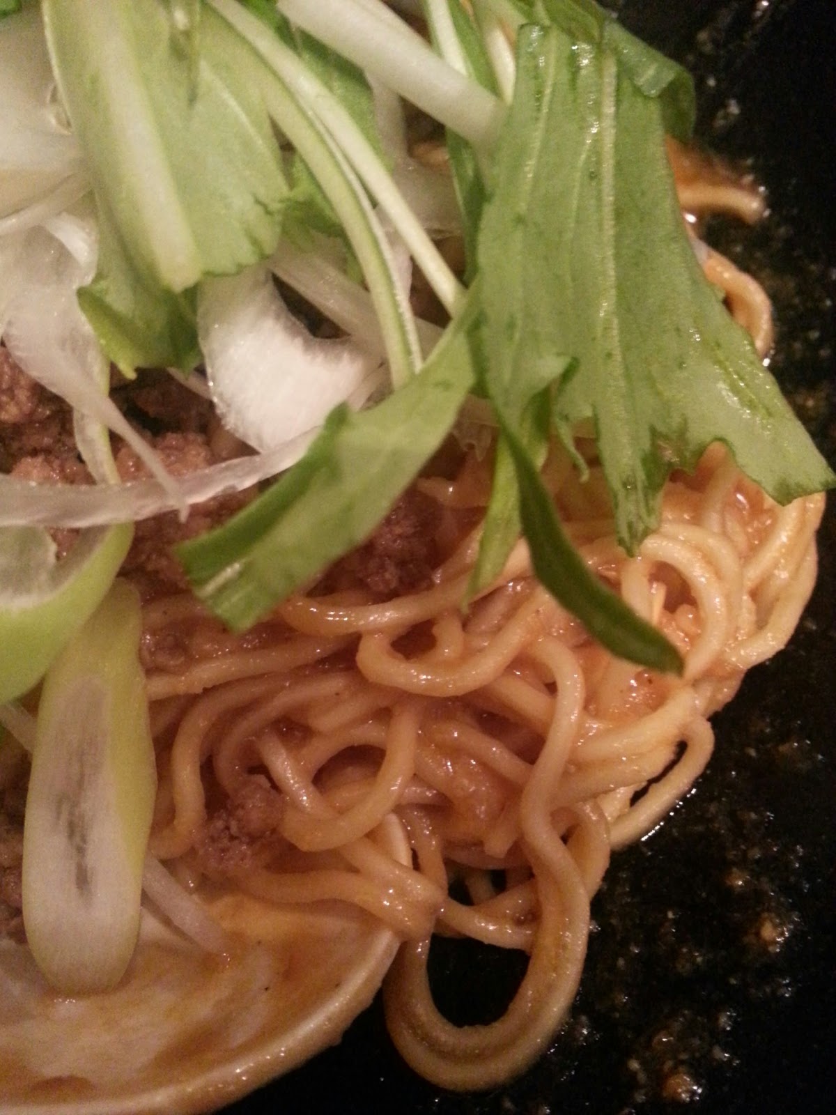 でてきた担々麺は、もともとある汁ありの担々麺の汁をちょっと濃いめにして、麺によく絡めた感じのもの。麺も同じっぽい。