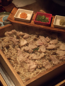 博多炉端蒸しは、天然水や軟水を素材によって使い分け、 蒸しあげる料理は旨味をぎゅっととじ込め、余分なものを落とします。写真は朝引き鶏、蒸してるのに生のような食感、余分な脂は落ちて、あっさり味の鶏肉はどれだけでも食べれそうです。
