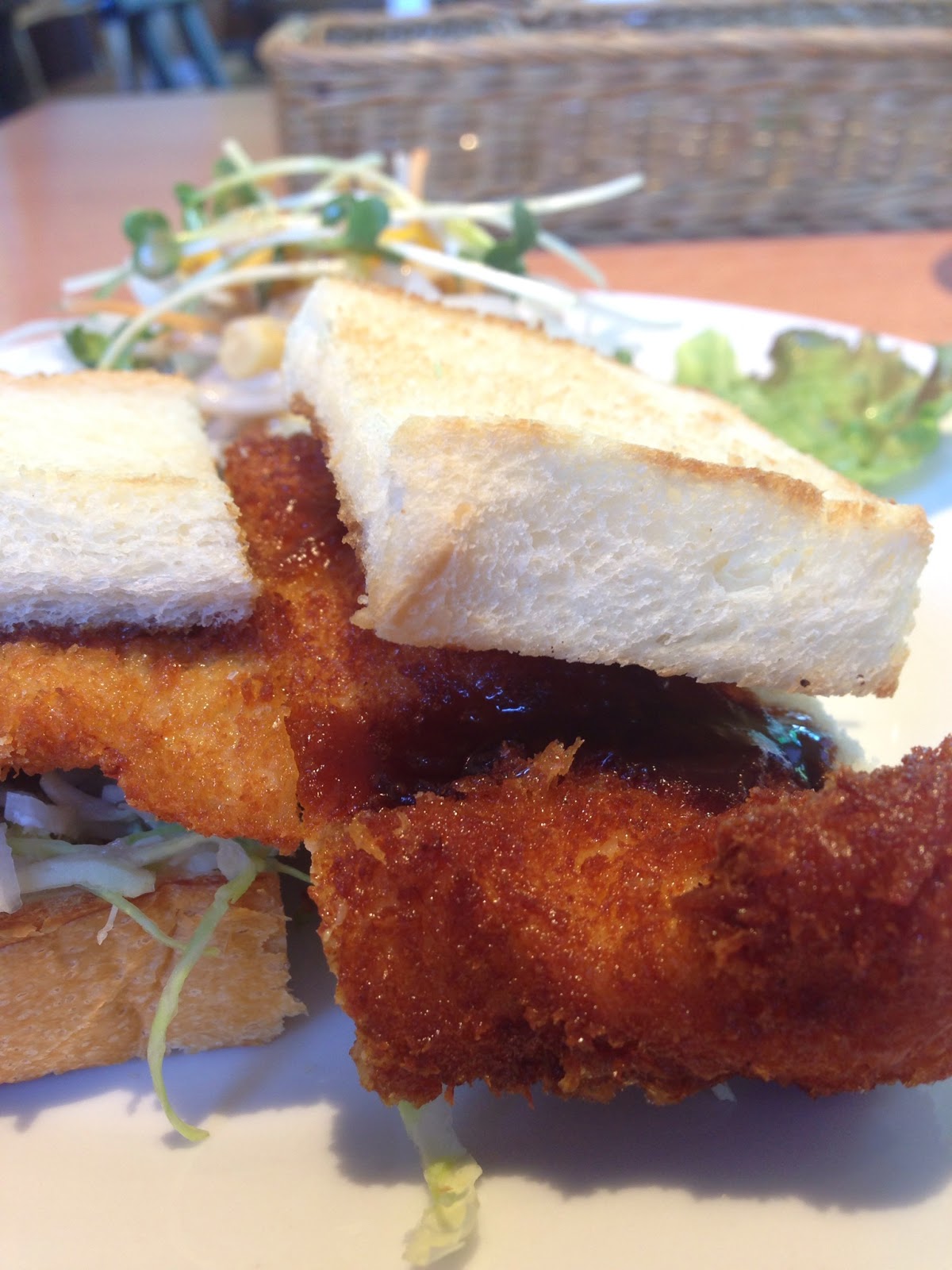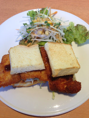 最初に出てきたのは、パン1枚に大きめのチキンカツが挟まっているチキンカツサンド、それにサラダが付いてきます。