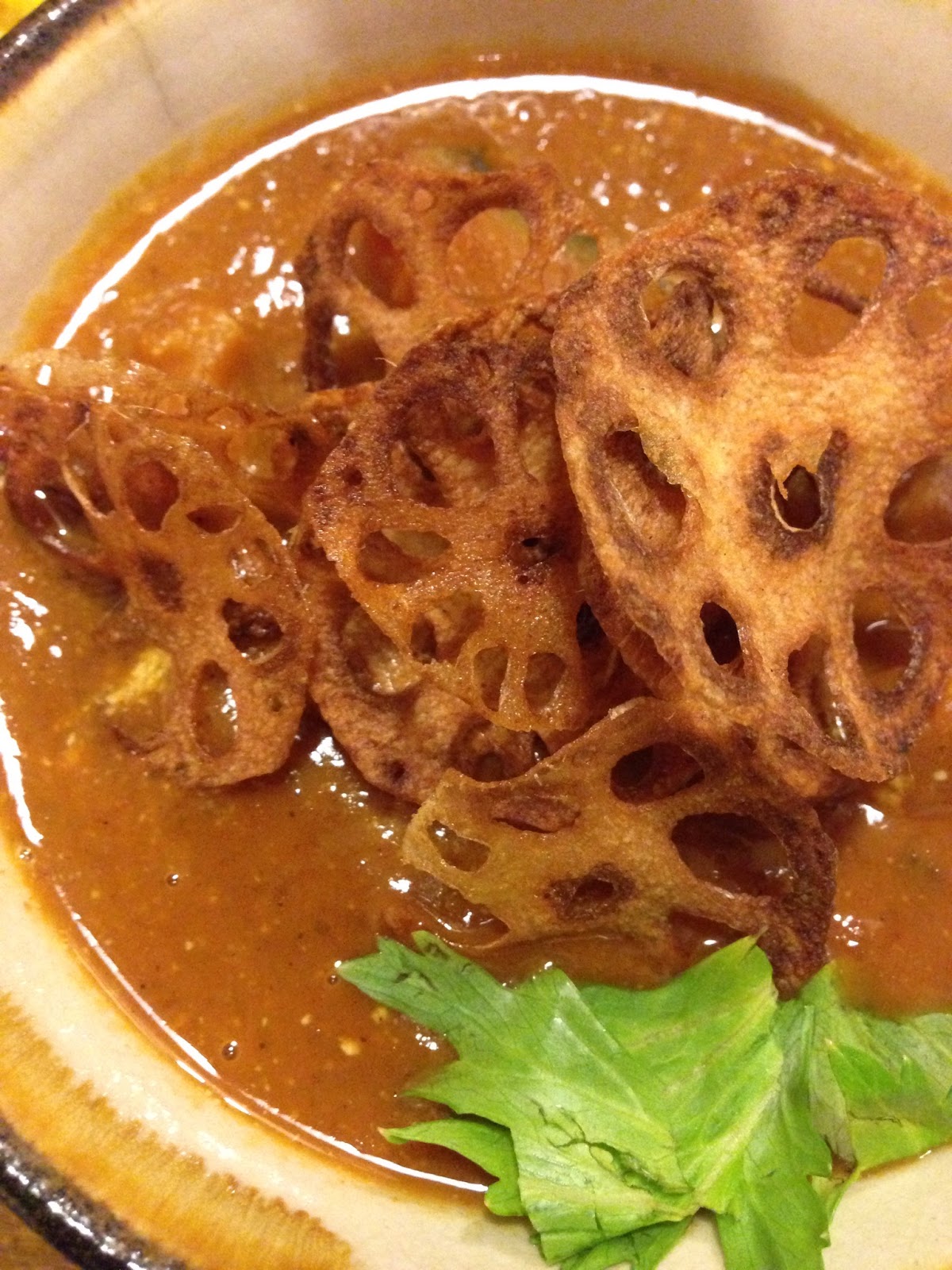 レンコンは薄く切られて素揚げになっています。レンコンの独特な歯応えはありませんが、パリパリ感があります。
