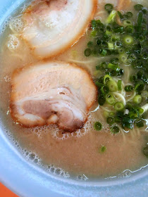 薄いチャーシューが2枚、少々のメンマとネギたっぷりで海苔が乗っている。麺はストレート麺で、スープは濃厚な豚骨スープで、表面上は泡立っている。放っておけば膜を張る濃いスープです。