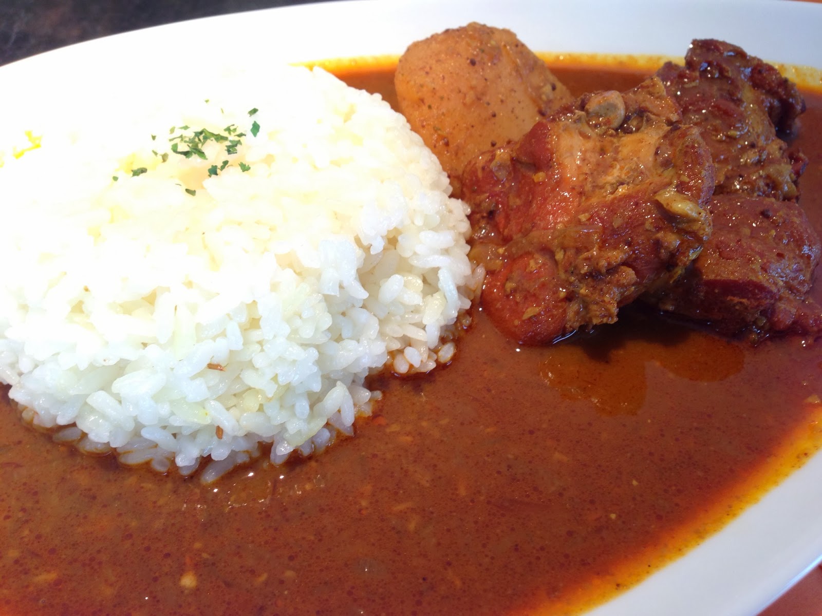 チキンもじゃがいももスパイスがまぶされてて、ライスとカレールーと具材が一体かしています。