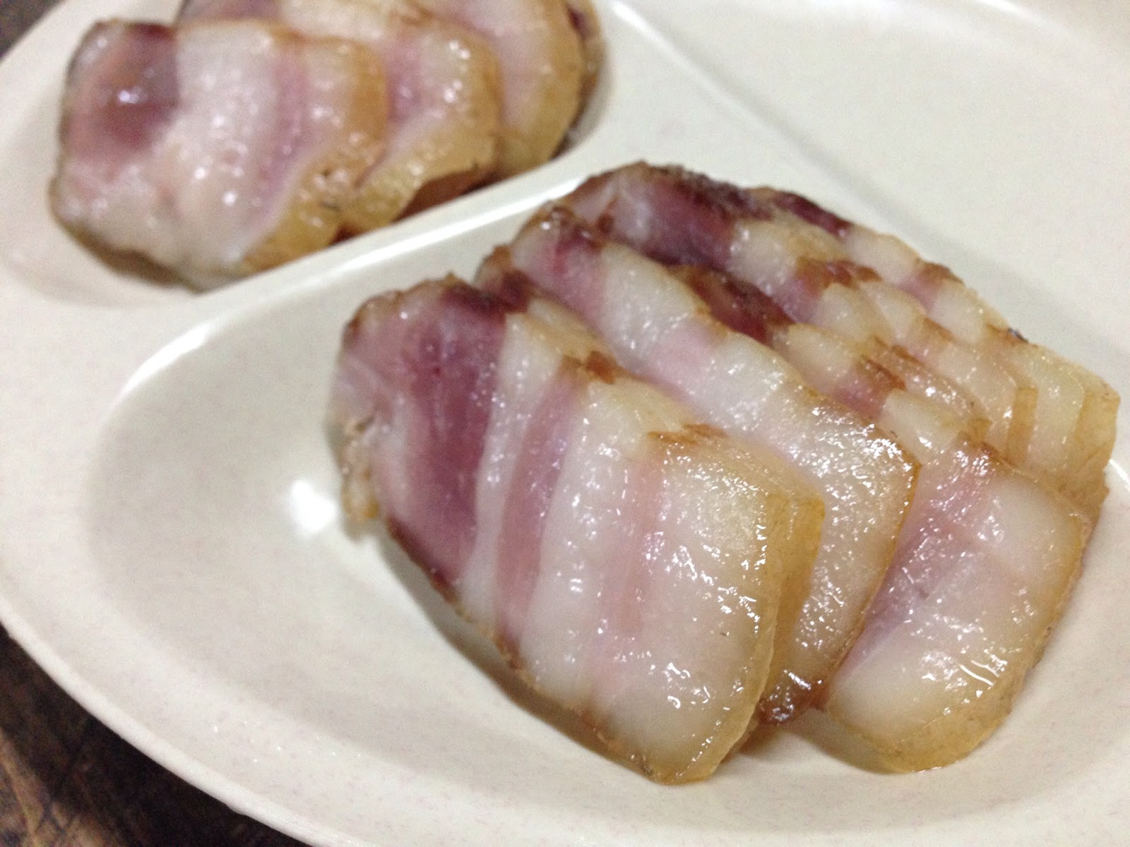 | んで、お得意の自家製ベーコン 色々あって、仕込み日数が短かくて出来具合は70点 |