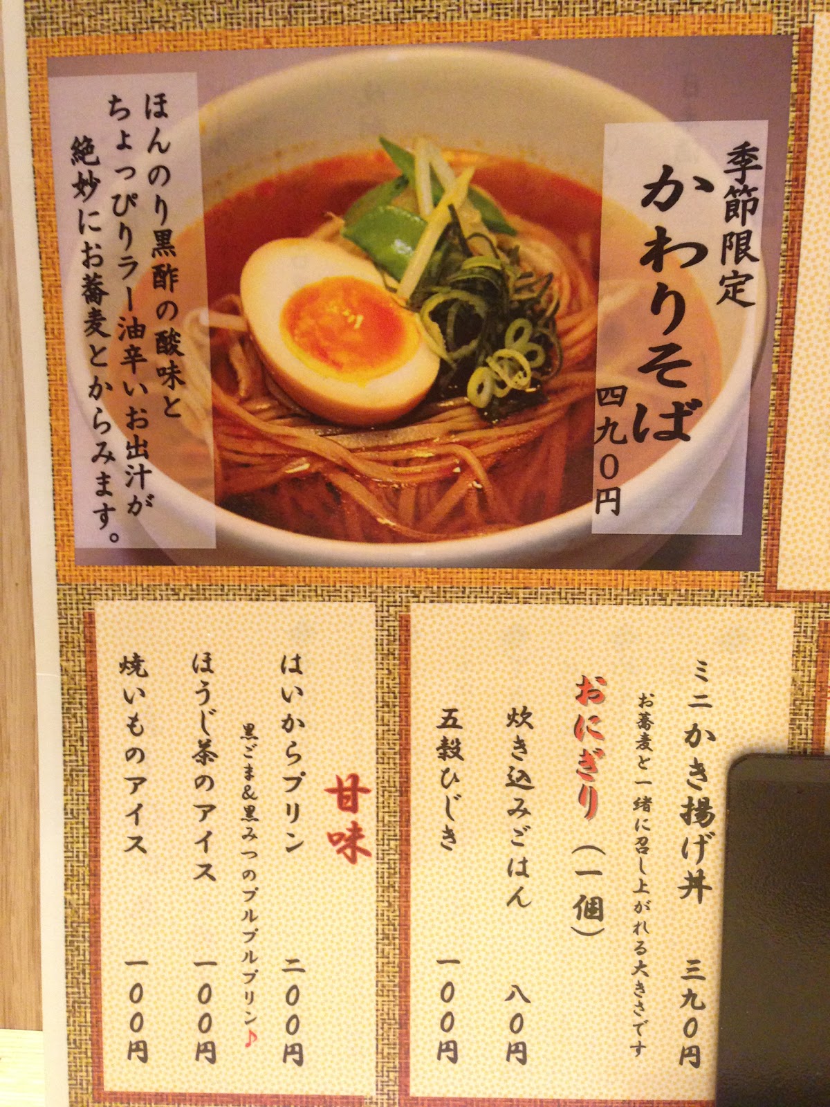 メニュー自体はあまり変わってませんでしたが、季節限定かわりそばと言う物が増えてました。